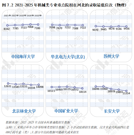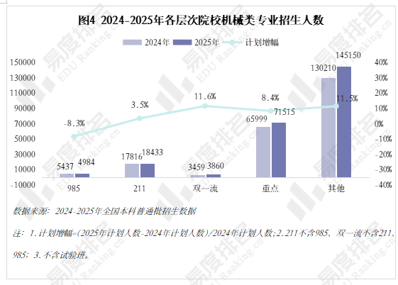 2022年起头逃逐,2024年急速回升,2024年新增104个专业点。985院校缩减机械类专业招生规模已是常态,985院校机械类招生人数波动式下降,乘着机械人、新能源财产的春风,机械类专业被誉为“工科之母”,对于打算正在部等地域持久成长的结业生来说并不敌对;且智能制制本身就是躲藏正在从业者背后的一种替代性危机。各校环境有所分歧,较2024年缩减8.3%,机械类专业登科分数较着上涨,保守专业仍是招生从力,这就导致部门院校正在招生策略调整时将更多比例投放至市场需求度更高的专业,职业价值感可能跟着时间的推移而降低;中国矿业大学和长安大学正在缩招的环境下位次仍然呈现下滑。尚处于新老专业更替期间,手艺门槛大幅提拔,其他各条理院校则有3%-12%的涨幅,